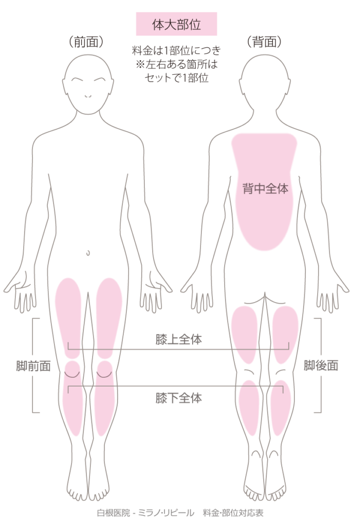 背中全体、膝上全体(太もも+裏太もも)、膝下全体(すね+ふくらはぎ)、脚前面(太もも+すね)、脚後面(裏太もも+ふくらはぎ)