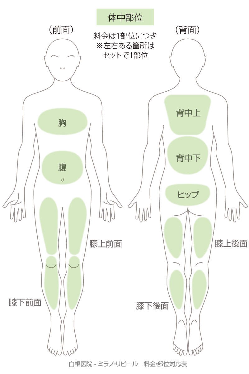 背中上または下、胸、腹、ヒップ、膝上前面(太もも)または後面(裏太もも)、膝下前面(すね)または後面(ふくらはぎ)
